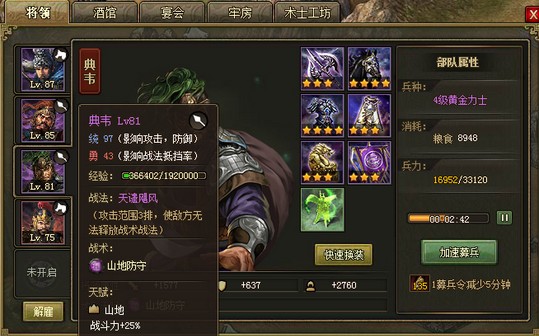 攻城掠地屯田是游戏中核心的资源生产与武将培养玩法,玩家可通过派遣武将屯田获取粮食、木材、石材、铁矿等基础资源,也能选择练兵模式快速提升武将等级,是支撑城池发展、兵力扩充与战力提升的关键系统。