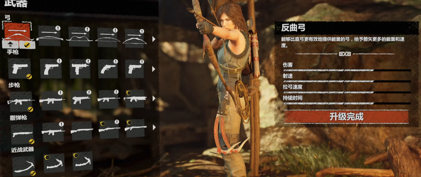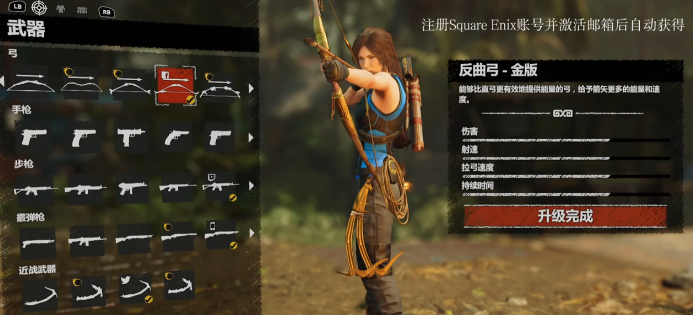 游戏内存在关于武器升级的误解需要澄清。黄金反曲弓无法通过常规收集材料强化,其强度完全依赖劳拉的技能树成长。建议优先解锁精准瞄准和绳索专家技能,这些能显著提升弓箭的实用性与战术价值。部分玩家反映的黄金武器属性更强属于认知偏差,开发团队已明确表示所有皮肤类武器均遵循基础武器数值模板。