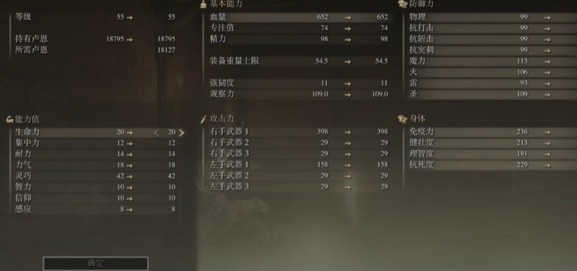 中期阶段当力量、灵巧、血量均达到20点后,建议优先将灵巧提升至50-60。灵巧不仅提高武器伤害,还影响闪避和弓箭性能,与武士职业特性高度契合。力量可逐步加到25-30点,配合双持武器加成足以使用大多数力敏系武器。可穿插将耐力提升至20点,穿戴更高级护甲提升生存能力。若使用频繁消耗战技的玩法,可适当分配少量点数至专注值。