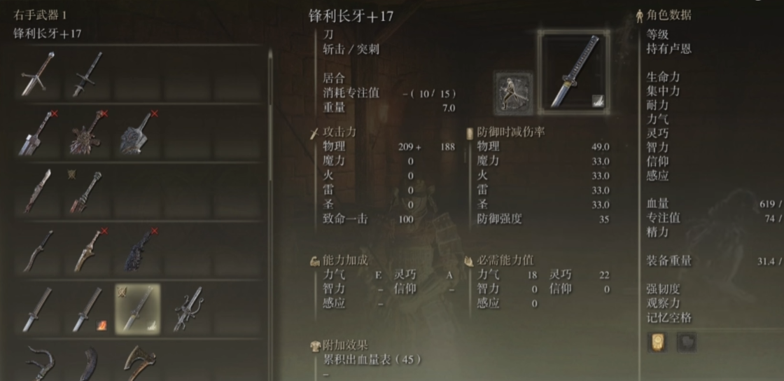 武士初期建议优先将生命值加到20点提升容错率,随后根据武器需求分配力量与灵巧。典型武器如猎犬长牙需要18力量和17灵巧,打刀则更依赖灵巧补正。拿起乌龟壳盾牌需要14点力量,这是前期关键属性节点。鲜血斩击战技虽强力但会消耗血量,因此生命值不可忽视。耐力建议维持在15-20点,确保能穿戴初期重甲且负重不超过中阈值,过高的耐力收益会逐渐递减。