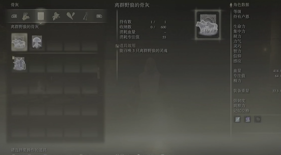 三狼骨灰是前期非常实用的召唤物,尤其适合新手。野狼的攻击能打断敌人动作,还能吸引仇恨,给你创造输出机会。三狼血量不高,面对范围攻击的敌人时容易阵亡。召唤时机很关键,最好在敌人背对你或处于硬直状态时使用。后期虽然能拿到更强力的骨灰,但三狼在开荒阶段依然是不错的选择。