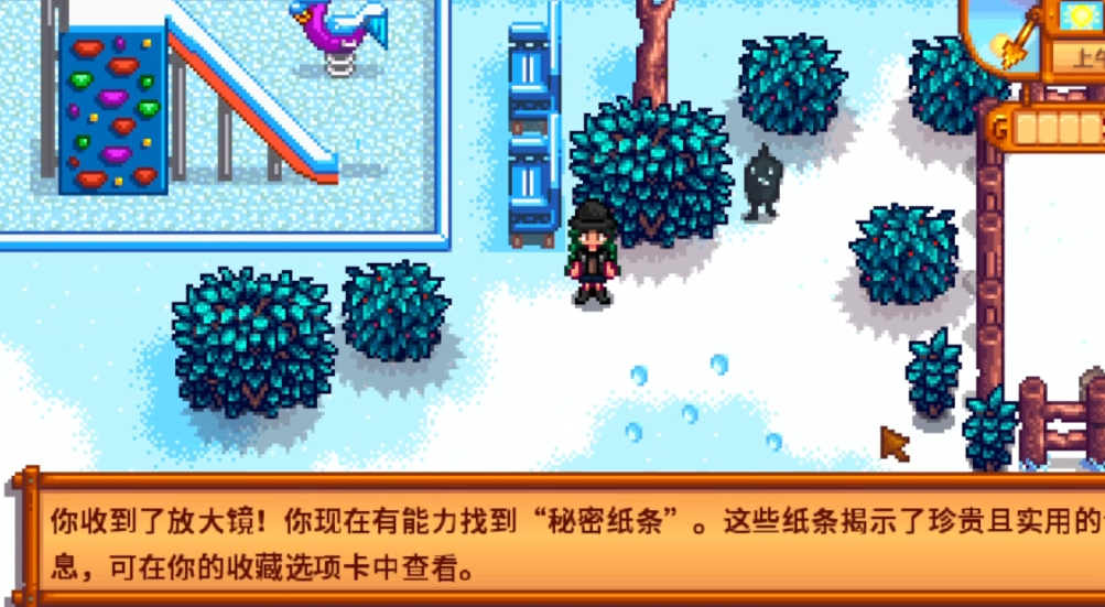 秘密纸条是隐藏着各种宝藏和谜题的重要收集品。想要查看它们,首先需要获得放大镜。放大镜的获取方式是在冬季的早晨6点至下午4点之间,从农场步行到巴士站时会触发冬日谜团任务,跟随暗影人的脚印找到灌木丛,调查后他会赠送放大镜。有了放大镜,就能在挖矿、砍树或打怪时随机捡到秘密纸条了。