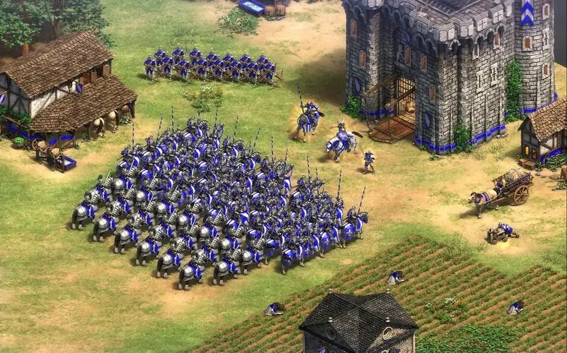 封建时代进阶城堡时代,需要准备八百食物与两百黄金,同时修建靶场、铁匠铺、市场任意两座封建专属建筑,满足条件便可在主城开启城堡时代升级。进入封建阶段就要逐步分配村民开采金矿,拓宽农田规模稳住食物产出,木材资源用来修建防御建筑与前置设施,少量村民采集石料为后续发展铺垫。这个阶段可以研发城镇警戒、负重采集类科技,强化主城防守能力与村民搬运效率,升本过程保留足量经济人口,少造作战单位把资源全部倾斜经济运营,城堡时代解锁之后就能修建第二座城镇中心,大幅提升村民量产速度,拉开人口与经济发育差距。